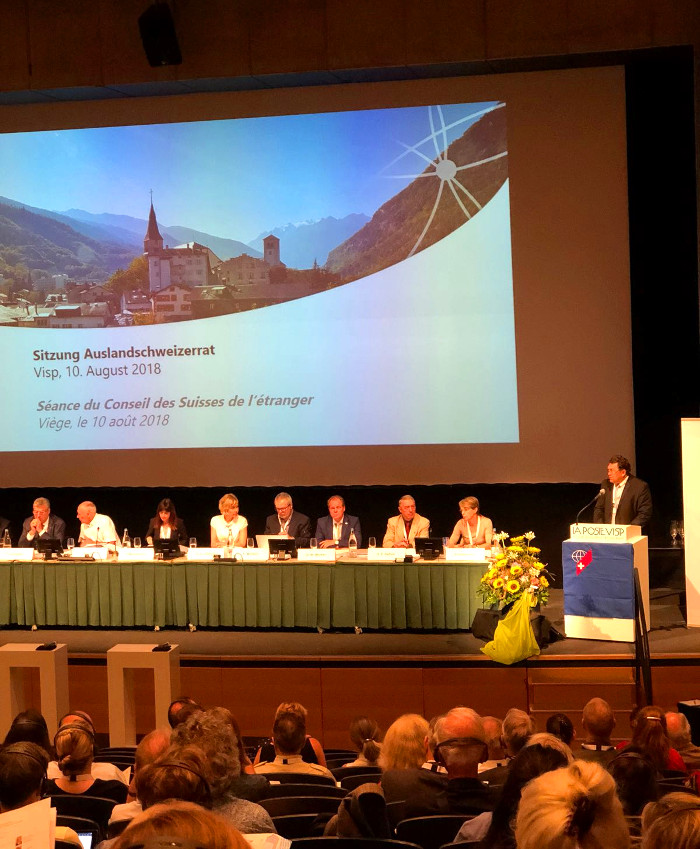 ausserhalb der Schweiz wohnhafte Schweizerbürger zum Kongress der Auslandschweizerorganisation ASO, diesmal vom in Visp. Am Freitag behandelten die 100 Ratsmitglieder aus allen Kontinenten die Themen E-Voting, Ergänzungsleistungen für Rückkehrende, Konten bei Schweizer Banken, die Vertretung im Parlament und die Errichtung einer Erinnerungsstätte für die 1000 Schweizer Opfer des Nationalsozialismus. Zur kommenden Volksabstimmung über die Selbstbestimmungsinitiative der SVP brachten die Nationalräte Manfred Bühler und Carlo Sommaruga Pro- und Contraargumente ein. Das Plenum sprach sich in der anschliessenden Abstimmung fast einstimmig gegen die Initiative aus. Weil 2019 Parlamentswahlen sind beschloss der Rat, die Parteien über ihren Einsatz für die Auslandschweizer zu befragen, um aus den Antworten ein Ranking zuhanden der Wähler zu erstellen. Diesem Thema wird ein bedeutender Teil des Kongresses 2019 in Montreux gewidmet sein. - Am Samstagvormittag und Sonntag stehen Ausflüge zu Walliser Sehenswürdigkeiten auf dem Programm. Am Samstagnachmittag behandelt die Plenarversammlung die Beziehungen zwischen der Schweiz und der EU. Die Versammlung können Sie hier live mitverfolgen: www.aso-