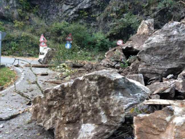 FALMENTA-08-10-2017-Als Folge des Steinschlags ist die Strasse zwischen Malesco und Cannobio unterbrochen. Etliche Kubikmeter Felsbrocken, Erde und Bäume sind auf die Talstrasse auf der Höhe von Ponte Falmenta niedergegangen, so dass die Strasse gesperrt werden muss. Der Steinschlag hat das Strassenbett schwer beschädigt. Es handelt sich um das xte derartige Vorkommnis. An Ort sind nebst der Feuerwehr auch bereits die Techniker eingetroffen, um die Schwere des Schadens und die Dauer der Instandstellung abzuschätzen.
