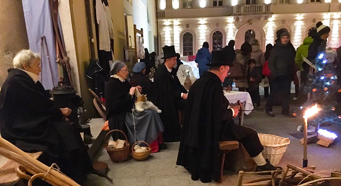 des Weihnachtsmarktes. Ab 16.30 trat auf der Piazza Rovereto die Theatergruppe von Varzo auf mit ihrer lebenden mechanischen Krippe, die vom "Geruch von Jerusalem" aus der Frohen Botschaft inspiriert ist.
